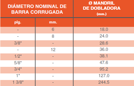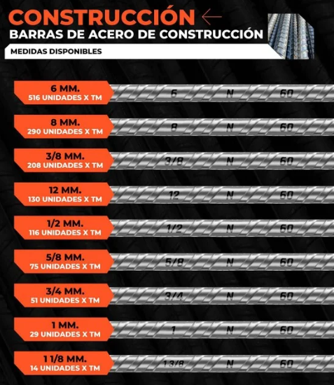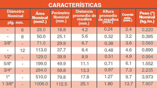Barras de 9 m y 12 m de longitud en los siguientes diámetros: 6 mm, 8 mm, 3/8", 12 mm, 1/2", 5/8", 3/4", 1", 1 3/8".USO