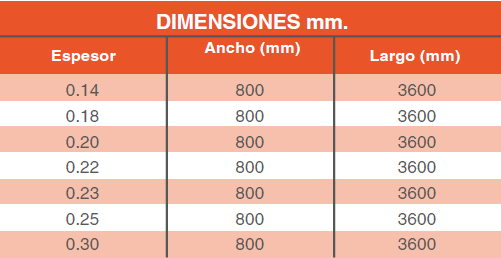 Rojo Prepintado en : 0.14 x 800 x 3600 / 0.18 x 800x 3600 / 0.20 x 800 x 3600 / 0.22x 800x 3600 / 0.25 x 800 x 3600 / 0.30 x 830 x 3600