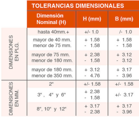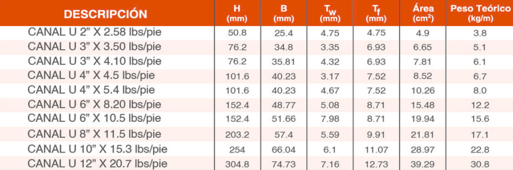 Perfil laminado en caliente de sección transversal en forma de U, en norma Americana (dimensiones en pulgadas).